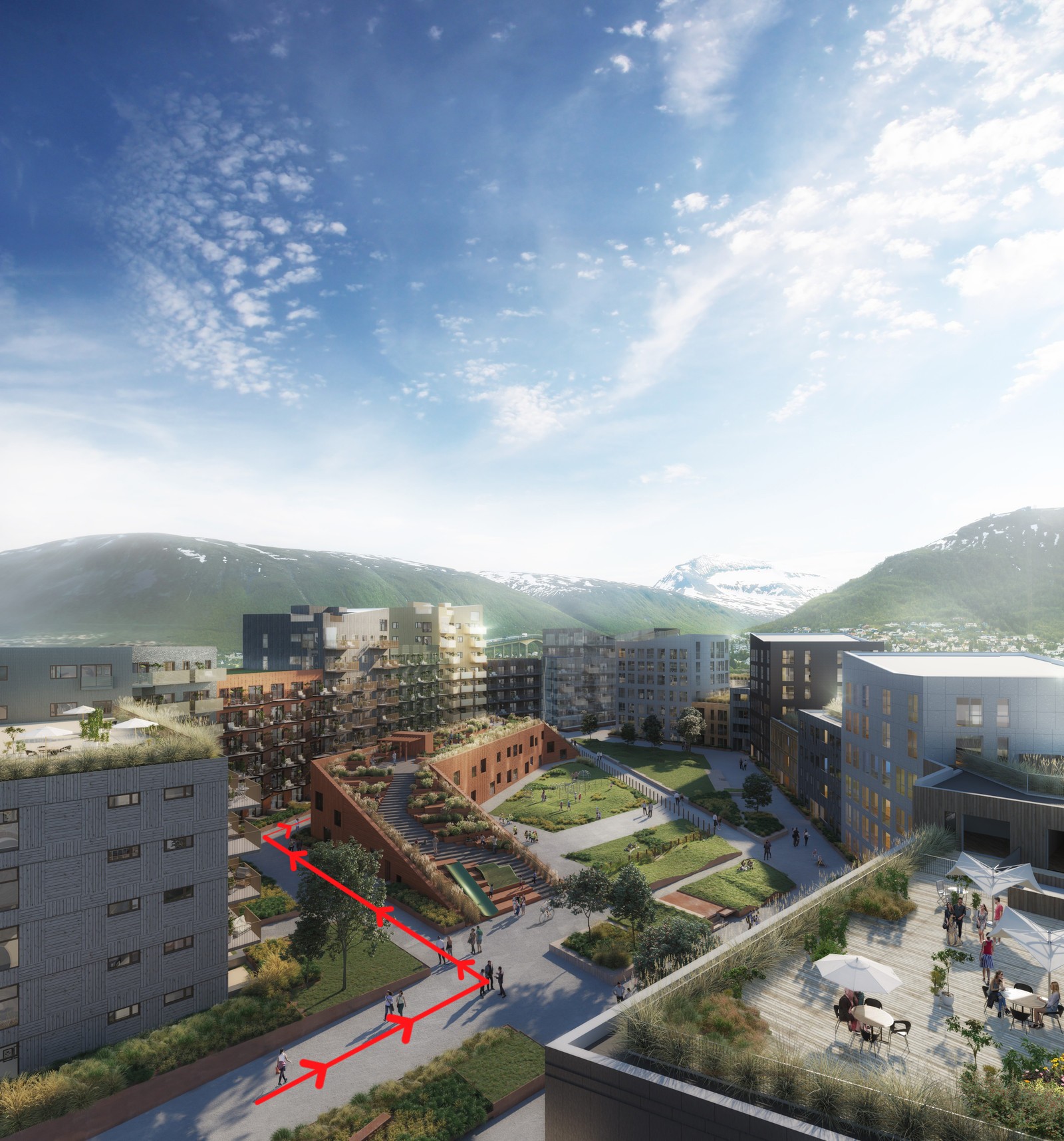 mellom leilighetskompleksene (se bildet under).Gå opp bakken bak Maskinverkstedet (det grønne bygget).